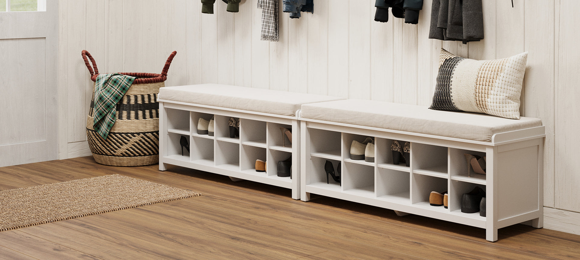 Ten 7.5in. wide x 6in. tall shoe cubbies. Center spacers can be removed to create tall shoe storage for seasonal change from summer lip flops to winter boots.