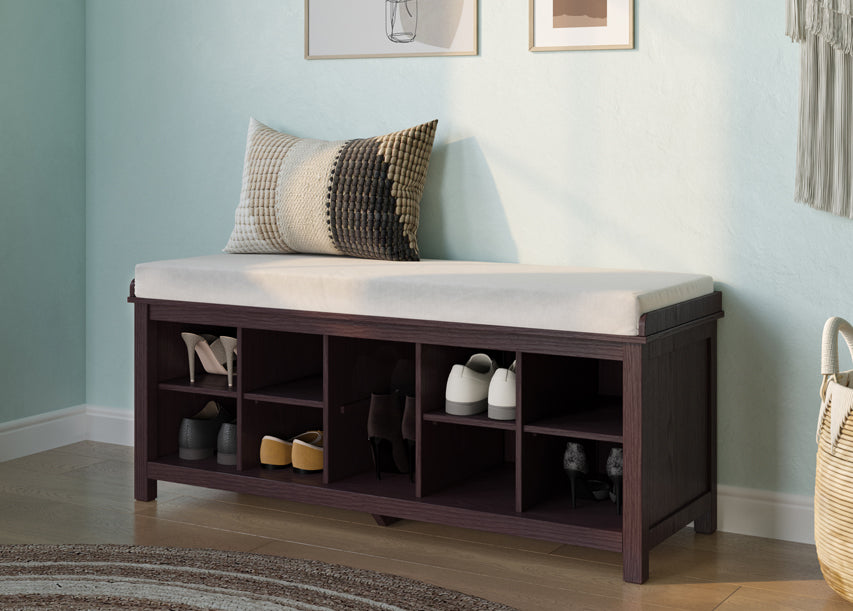 Elevate your home's organization with the John Louis Home Solid Wood Shoe Storage Bench. This multi-functional bench combines a comfortable seat with integrated storage for up to ten pairs of shoes, helping you eliminate entryway clutter. Its 100% solid wood construction ensures that it's not only a beautiful piece but also one that is built to last.